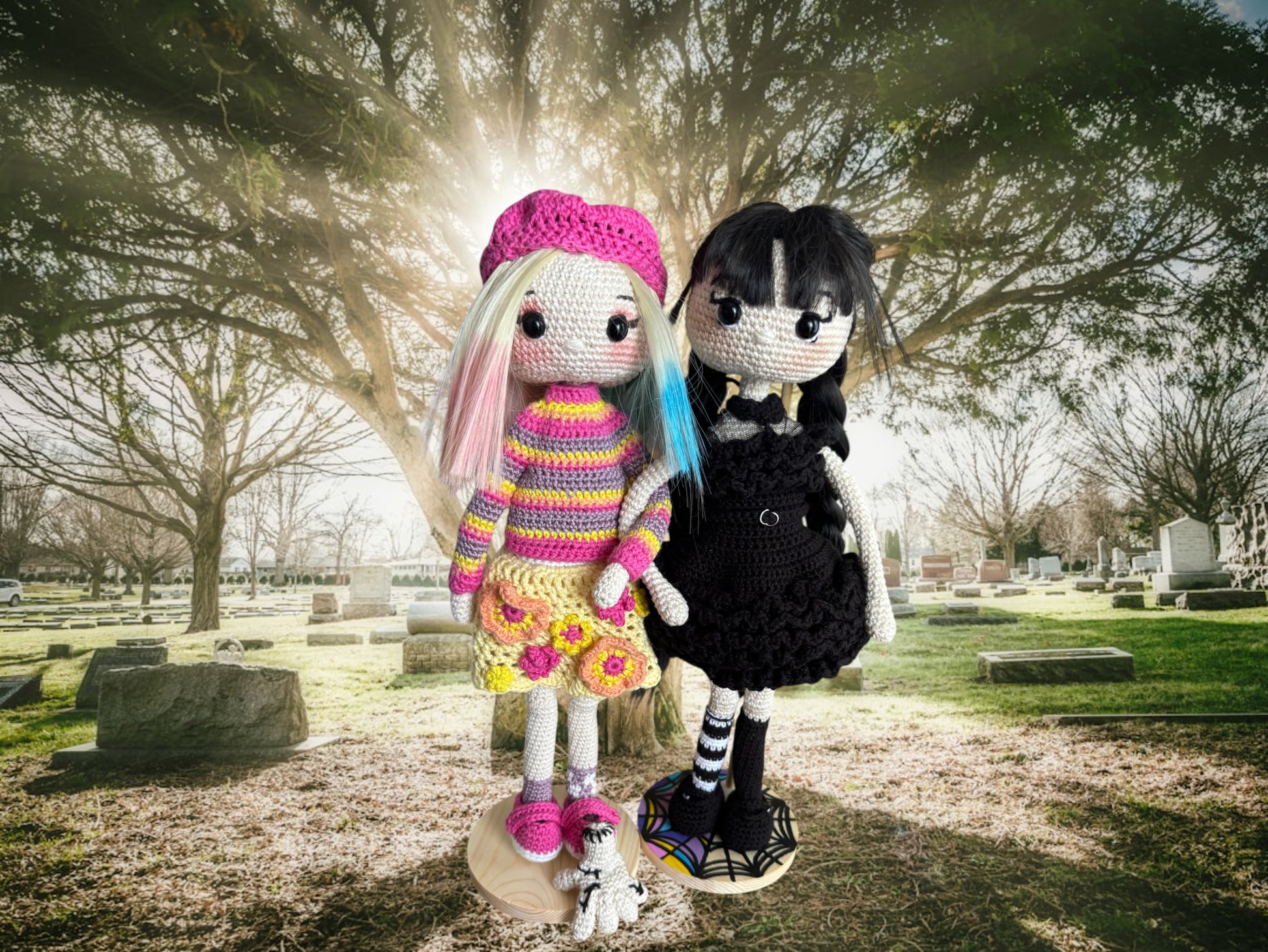 Cet adorable amigurumi représente Enid Sinclair, la pétillante colocataire de Mercredi Addams à Nevermore. Réalisée au crochet avec des dimensions assorties au modèle de Mercredi, Enid affiche ses cheveux blonds méchés de rose et bleu et son style unique, à la fois doux et plein de caractère. Un compagnon lumineux et coloré pour compléter la collection Wednesday !