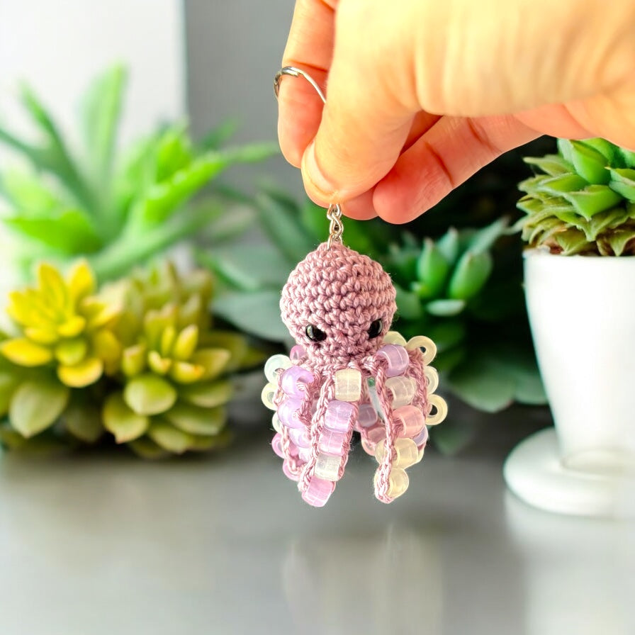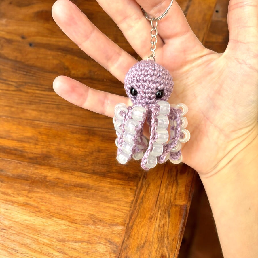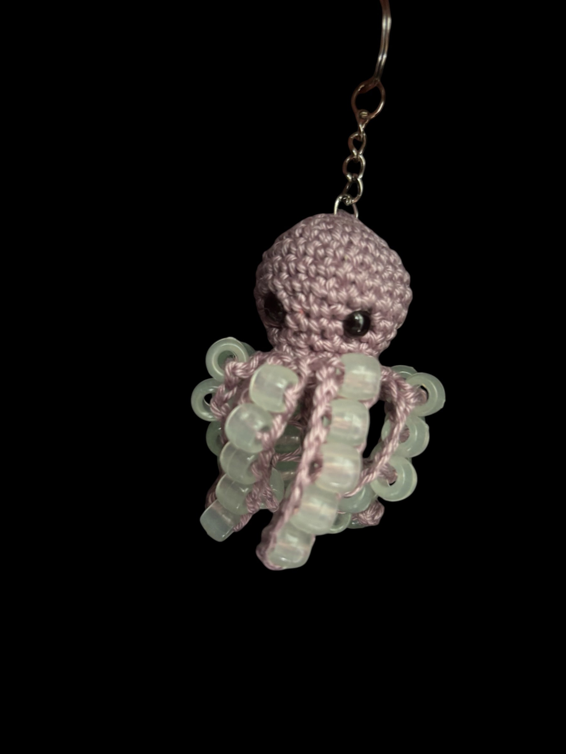 Ce porte-clé pieuvre au crochet est orné de petites perles qui changent de couleur à la lumière UV et brillent dans le noir. De jour comme de nuit, elle attire tous les regards ! Avec ses tentacules pleins de charme et son air malicieux, elle est parfaite pour les amateurs d’originalité, de kawaii et de magie lumineuse.